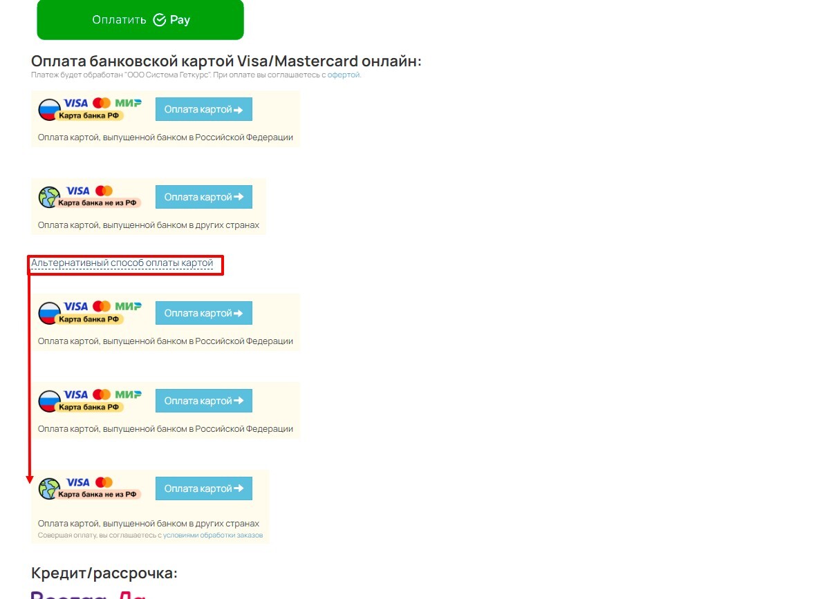 Если при оплате высвечивается сумма в ЕВРО+VAT, то перейдите в альтернативные методы и выберите способ оплаты, как указано на картинке ниже